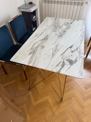 Elegante conjunto de mesa con sobre de mármol y patas metálicas doradas, acompañado de dos sillas. - Diseño moderno y sofisticado. - Patas finas y estilizadas en acabado dorado. - Tablero con veteado de mármol.