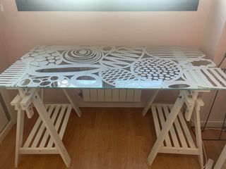 Mesa de cristal con un diseño moderno y original, apoyada sobre caballetes de madera. - Superficie de cristal transparente. - Diseño decorativo blanco sobre el cristal. - Base de caballetes de madera. 148x73 cm