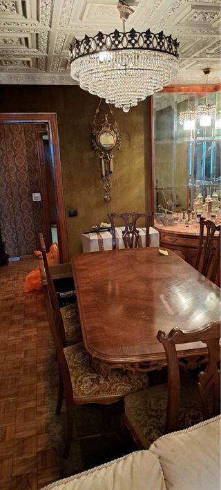 bonita mesa clasica y 6 sillas a juevo con tapiceria, necesita barnizar, tiene extensiones laterales de 50cm por cada lado para alargar