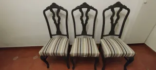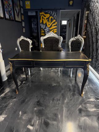 Elegante conjunto de mesa y tres sillas de estilo clásico. El diseño combina a la perfección la sobriedad del negro con detalles dorados. Se vende en pack o por separado : Mesa (250€) Sillas (350€) - Mesa con superficie lisa y patas curvas. - Sillas con tapicería capitoné y estructura ornamentada.