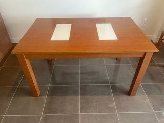 Elegante mesa de comedor con superficie de madera, color cerezo y detalles en cristal blanco. - Diseño moderno y funcional. - Patas de madera robustas. Medidas: 140x90x75 cm. Extensible 40 cm.