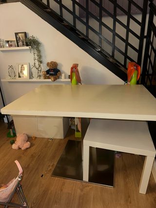 Mesa de diseño moderno. - Patas metálicas. - Tablero liso. Mesa de Ikea. Se puede desmontar para el transporte. Hay un total de 4 mesas iguales disponibles. Pueden tener algún desperfecto en el tablero pero aún se pueden usar durante mucho tiempo. Se puede venir a recogerlas. Se pueden pedir juntas o por separado. El precio es por cada una de las mesas