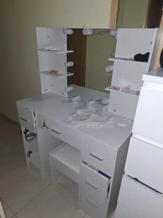Tocador blanco con espejo y luces integradas. - Diseño moderno con estantes. - Incluye taburete a juego. - Cajones para almacenamiento.