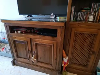 Conjunto de muebles de salón en madera rústica. Ideal para crear un ambiente cálido y acogedor. - Mueble para TV con puertas y espacio de almacenaje. - Estantería media con baldas y puerta inferior. - Conjunto de mesa y 6 sillas. - Acabado en madera natural con detalles de estilo rústico vintage. - Cristal en mesa y mueble de televisión. Recogida y transporte a cuenta del comprador.