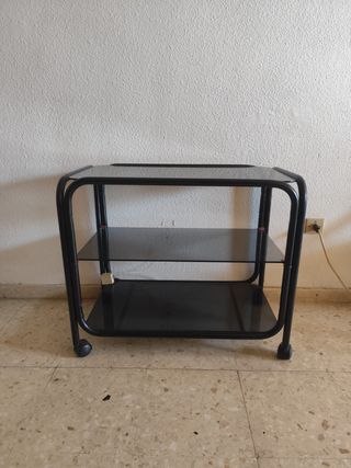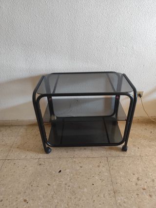 Mesa auxiliar de cristal negro con estructura metálica. Tiene dos estantes de cristal y ruedas para facilitar su movimiento. Está en perfecto estado - Perfecta para espacios reducidos. - Diseño moderno y elegante. - Fácil de limpiar. Medidas: 80 largo x 45 ancho x 69 alto - Estructura metálica. - Bandejas de cristal. - Ruedas para fácil movilidad.