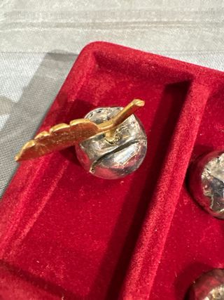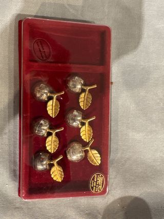 Set de 6 manzanas decorativas con hojas doradas, ideales para identificar lugares en la mesa o como adorno. - Diseño de manzana con hoja. - Acabado plateado y dorado. - Presentadas en caja roja.