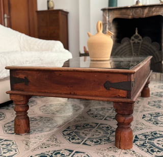 Mesa de centro en madera de mango, en perfecto estado. Tiene cristal a medida y puede usar con o sin el. 70cm x 123cm x 38cm de altura - Tablero de cristal transparente. - Base de madera maciza de mango. - Patas torneadas con detalle. - Herrajes metálicos decorativos.