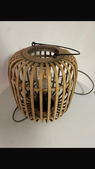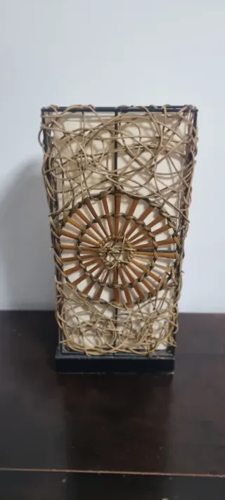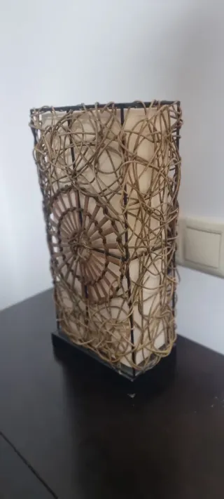 Lámpara de mesita de noche con un diseño único y natural. - Estructura exterior de mimbre entrelazado. - Detalle central circular de varillas de madera. - Base cuadrada de metal. Medidas: (Alto,ancho,fondo:36x17x10cm) Tengo 2 unidades. El precio que se marca en el anuncio es por unidad. PRECIO NO NEGOCIABLE