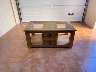 Elegante mesa de centro con un diseño rústico y funcional. - Fabricada en madera de alta calidad. - Encimera de cristal. - Cajones integrados para almacenamiento.