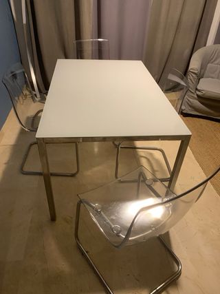 Conjunto de mesa con superficie de cristal y cuatro sillas. - Diseño moderno y elegante. - Patas y estructura de las sillas en blanco Esta prácticamente sin usar la compre hace un año y poco y no se a usado a estado mas bien de decoracion
