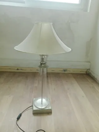 Elegante lámpara de mesa con un diseño clásico y materiales de calidad. - Base cuadrada de metal. - Cuerpo central de cristal transparente. - Pantalla cónica de tela. - Acabado plateado.