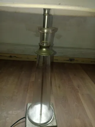 Elegante lámpara de mesa con un diseño clásico y detalles decorativos. - Pantalla de cristal esmerilado con grabados. - Adornos metálicos en la parte superior. - Colgantes de cristal y cuentas. - Base de metal ornamentada.