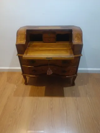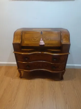 Elegante escritorio decorativo con un diseño clásico. - Acabado en madera de alta calidad. - Detalles ornamentales en la tapa y los cajones. - Tiradores de estilo vintage.