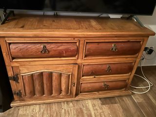 Mueble de estilo rústico con un diseño único. - Acabado en madera natural. - Cuenta con varios cajones para almacenamiento. - Puerta con detalle decorativo. - Tiradores ornamentales.
