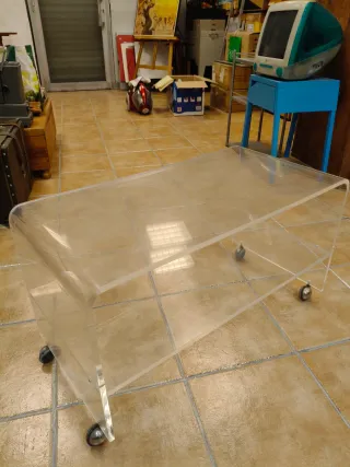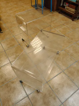 Se venden dos mesas auxiliares de metacrilato. - Diseño moderno y minimalista. - Patas con ruedas para fácil movilidad. Medidas mesa grande: ancho 80cm Altura 46cm y fondo 40 cm Medidas mesa pequeña: ancho 55 cm Altura 56 cm y fondo 40 cm. ESTE ARTICULO NO SE ENVIA, a recoger en Lleida capital. El precio es por las dos mesas.