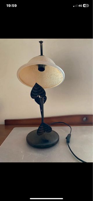 Preciosa lamparita de mesa de estilo vintage. Ideal para añadir un toque elegante a cualquier espacio. - Base de cerámica y metal con detalles dorados. - Pantalla de tela color crema. - Perfecta para una mesita de noche o escritorio.