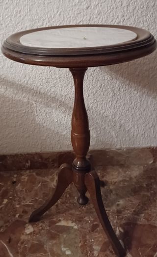 Elegante mesita auxiliar de madera y mármol. Ideal para cualquier estancia. - Superficie de mármol blanco. - Estructura de madera oscura, con un diseño clásico y elegante. - Tres patas torneadas que le dan estabilidad.