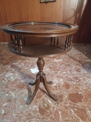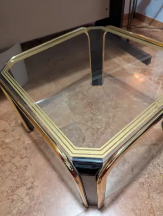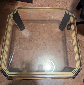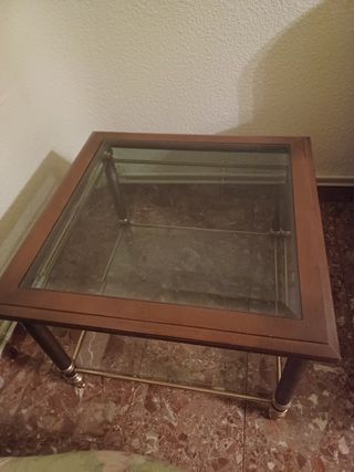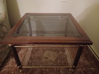 Preciosa mesa de centro para el salón. Es una pieza elegante y en buen estado. - Tiene una superficie de cristal. - La estructura es de madera oscura con detalles dorados. - Dispone de un estante inferior de cristal. Tengo dos mesas, el precio es de una sola.Pero si se queda las dos se puede ver precio.