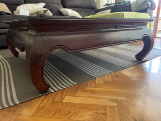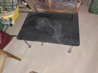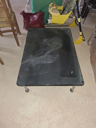 Mesa baja de color negro. Tiene una pata coja. Tiene bastante polvo por estar en un trastero pero con un trapo se queda perfecta. Cualquier duda contacte sin compromiso!