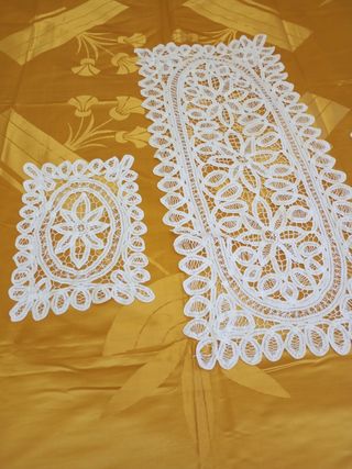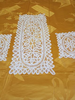 Elegante juego de encaje blanco, hecho a mano. Incluye un camino de mesa rectangular y dos cubrebandejas ovalados. Son piezas delicadas y bonitas, ideales para decorar una mesa. - Material: Encaje blanco. - Piezas incluidas: 1 camino de mesa + 2 cubrebandejas. - Diseño: Ovalado y rectangular con motivos florales.