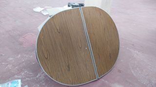 Mesa plegable con un diseño práctico para caravanas o espacios reducidos. Su superficie es de un tono beige claro y el borde es de madera oscura. - Patas plegables para fácil almacenamiento. - Estructura robusta. Pertenecía a una Sun Roller Phenix 450