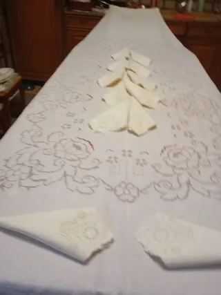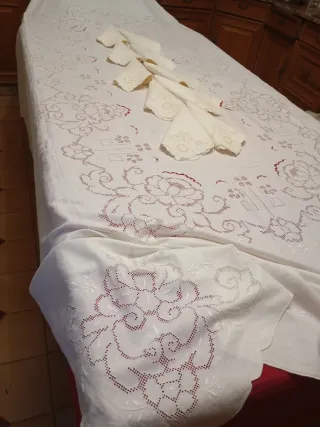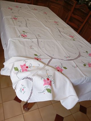 Preciosa mantelería artesanal con bordado y deshilado siciliano. Te quedará una mesa espectacular. - Diseño floral detallado. - Incluye servilletas combinadas.Mide 2,65 x 1,80