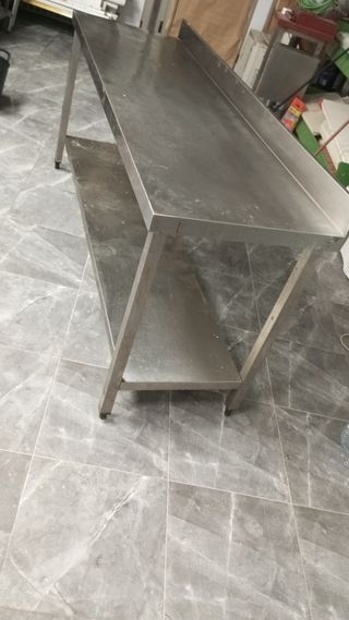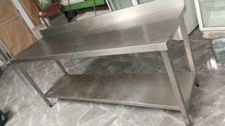 Mesa de trabajo de acero inoxidable, ideal para cocinas o talleres. Cuenta con un práctico estante inferior para almacenamiento adicional. - Superficie lisa y fácil de limpiar. - Construcción robusta y duradera. - Diseño funcional con dos niveles.