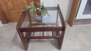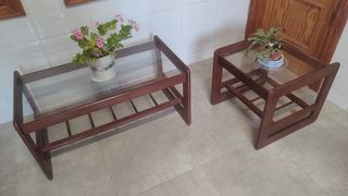 Conjunto de dos mesas bajas para salón con estructura de madera y tapa de cristal. - Diseño moderno y elegante. - Madera en tono marrón oscuro. - Tapa de cristal transparente. También se venden por separado. Mesa grande 30€ y pequeña 20€ Las medidas de la pequeña son 46*46*43
