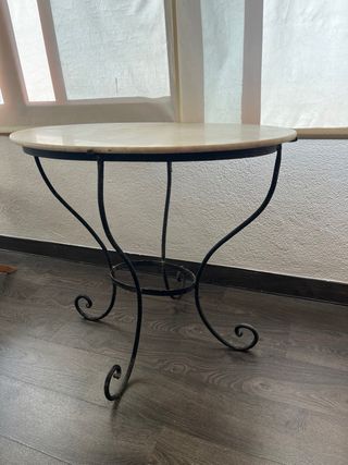 Elegante mesa artesanal con base de forja y sobre de mármol. - Diseño único. - Ideal para interiores o exteriores. - Combinación de colores beige y negro.
