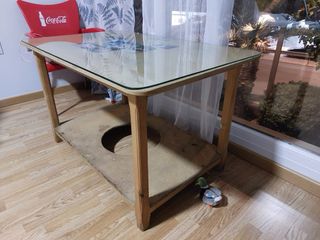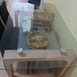 Mesa con superficie de cristal y estructura de madera. - Diseño moderno y elegante. - Combinación de materiales que aportan calidez y ligereza.