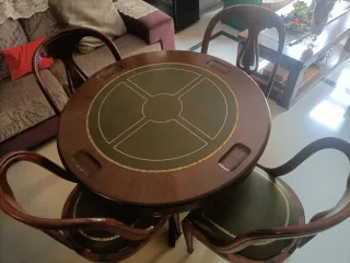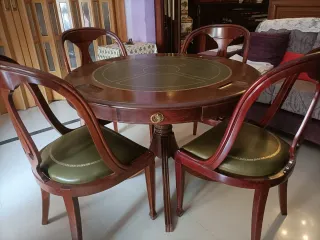 Conjunto de mesa redonda con tablero tapizado en piel y cuatro sillas a juego. - Mesa redonda con detalles en piel. - Incluye 4 sillas. - Diseño clásico y elegante.