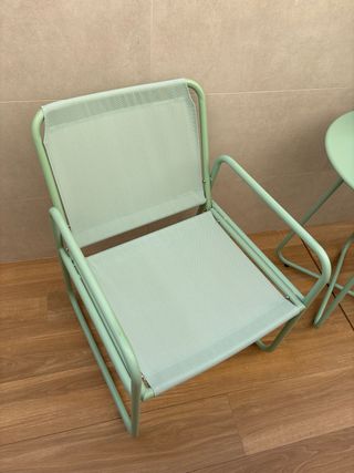 PRODUCTOS NUEVOS DE OCTUBRE DE 2025. SIN USAR. Conjunto de mesa y dos sillas para terraza o balcón. Ideal para disfrutar del aire libre. - Estructura de metal resistente. - Asientos y respaldo de tela. - Diseño moderno y ligero.