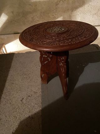 Elegante mesa auxiliar de madera con intrincados tallados florales y un detalle central con incrustaciones. - Diseño circular. - Tallado detallado. - Acabado en tono madera natural. - Medidas 39 cm de alto y 37 cm de ancho.
