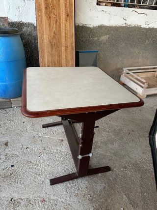Mesa plegable de madera y metal, ideal para espacios pequeños. Tiene un diseño sencillo y práctico. - Se encuentra en buen estado, con algunas señales normales de uso.