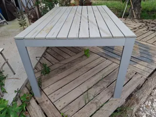 Conjunto de mesa y sillas de exterior que necesitan una mano de restauración. Ideal para darles una nueva vida. Estructura metálica de la mesa y las sillas.