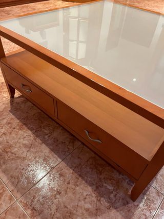 Elegante mesa de centro con un diseño moderno y funcional. Perfecta para dar un toque de estilo a tu salón. - Encimera de cristal. - Estructura de madera. - Incorpora cajones para almacenamiento.