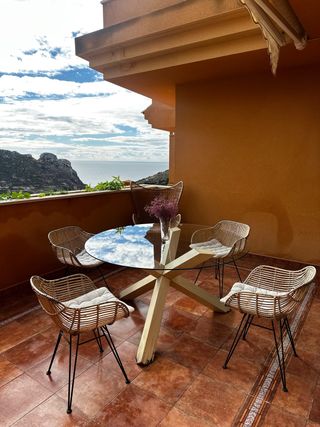 Mesa cubo 123X123 perfecto estado con 4 sillones con cojines con algún desperfecto en los brazos sobre todo dos de ellos. Recoger en Puerto de Mazarrón