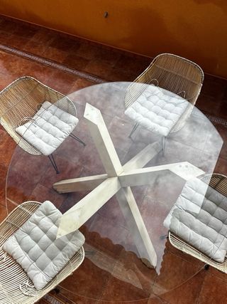 Conjunto de mesa con sobre de cristal y cinco sillas de ratán. Ideal para tu terraza o casa. - Mesa con base de madera. - Sillas con cojines incluidos.