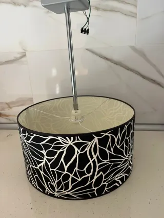 Lámpara de mesa con un llamativo diseño. - Pantalla con estampado floral blanco sobre fondo negro. - Base y pie metálicos plateados. - Materiales: tela, metal y plástico.