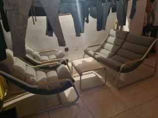 Conjunto de jardín Ámsterdam que incluye un sofá, dos sillones y una mesa de centro. - Diseño moderno y elegante. - Estructura metálica. - Cojines de tela cómodos.