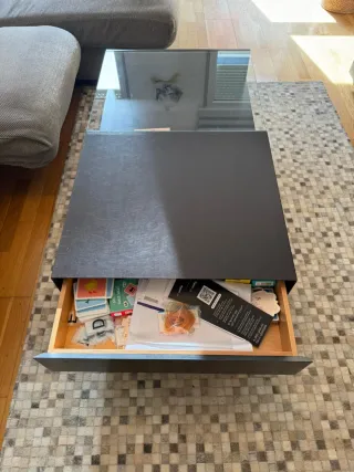 Elegante mesa de centro con un diseño moderno y funcional. - Combinación de madera y cristal. - Superficie dividida en tres secciones. - Base de madera oscura. - Encimera de cristal gris. Tiene unas pequeñas marcas de uso en las esquinas