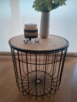 Mesa auxiliar con un diseño moderno y funcional, perfecta para cualquier rincón de tu hogar. - Tablero redondo con acabado en madera. - Base de metal con un diseño estilo cesta, se abre y permite guardar dentro Quedará preciosa en cualquier rincón 🤩 Nueva, apenas se ha usado