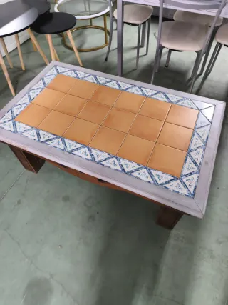Mesa de centro con un diseño único que combina madera y cerámica. - Encimera adornada con azulejos. - Cenefas decorativas en el borde. - Estructura de madera robusta.
