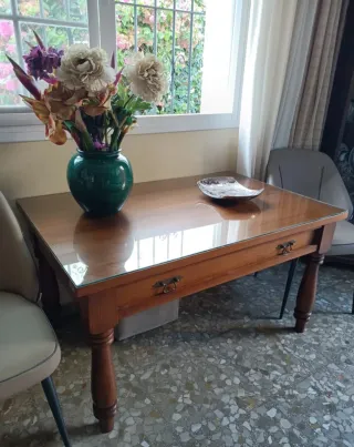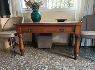 Elegante mesa de madera maciza con encimera de cristal. Diseño clásico con patas torneadas. Cajones con tiradores metálicos ornamentados. Está en muy buen estado, como se ve en las fotos. SE RECOGE EN SAN PEDRO DE ALCÁNTARA.