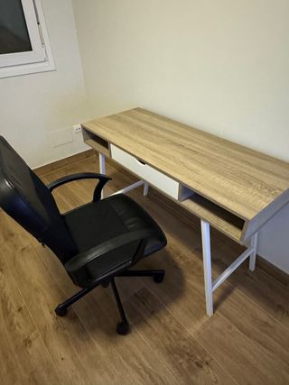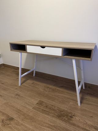 Mesa de escritorio con un diseño funcional y elegante. - Superficie de trabajo espaciosa. - Compartimentos de almacenamiento integrados. - Cajón con tirador de madera.