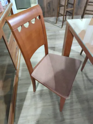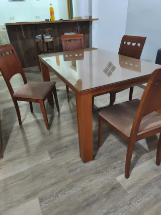 Conjunto de mesa de comedor con sobre de cristal y estructura de madera. - Diseño moderno y elegante. - Patas de madera maciza. - Tablero de cristal templado.
