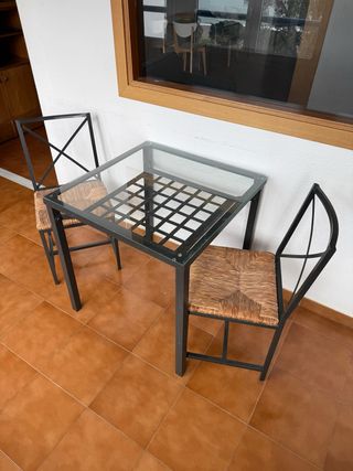 Conjunto de mesa y dos sillas con estructura de hierro y sobre de cristal. - Diseño moderno y elegante. - Ideal para espacios pequeños. - Sillas con asiento de mimbre. Se venden también por separado. Situado en Playa Virginia, El Palo, Malaga. Se está vaciando un piso entero y hay más muebles disponibles. Transporte no incluido, ubicado en un edificio con ascensor.