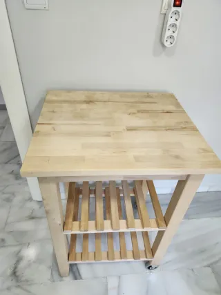 Mesa auxiliar de madera con un diseño práctico y funcional. - Estructura de madera clara. - Dos estantes de listones. - Ruedas para fácil movilidad.