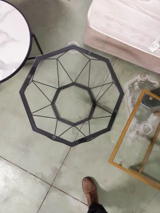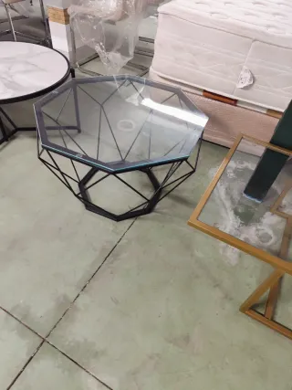 Elegante mesa de centro con un diseño geométrico moderno. Su estructura de forja le da un toque industrial y sofisticado. - Tapa de cristal transparente. - Base de forja negra. - Diseño octogonal.