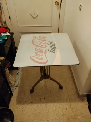 Mesa con diseño de Coca-Cola Light. - Superficie con el logo de Coca-Cola. - Base de metal.